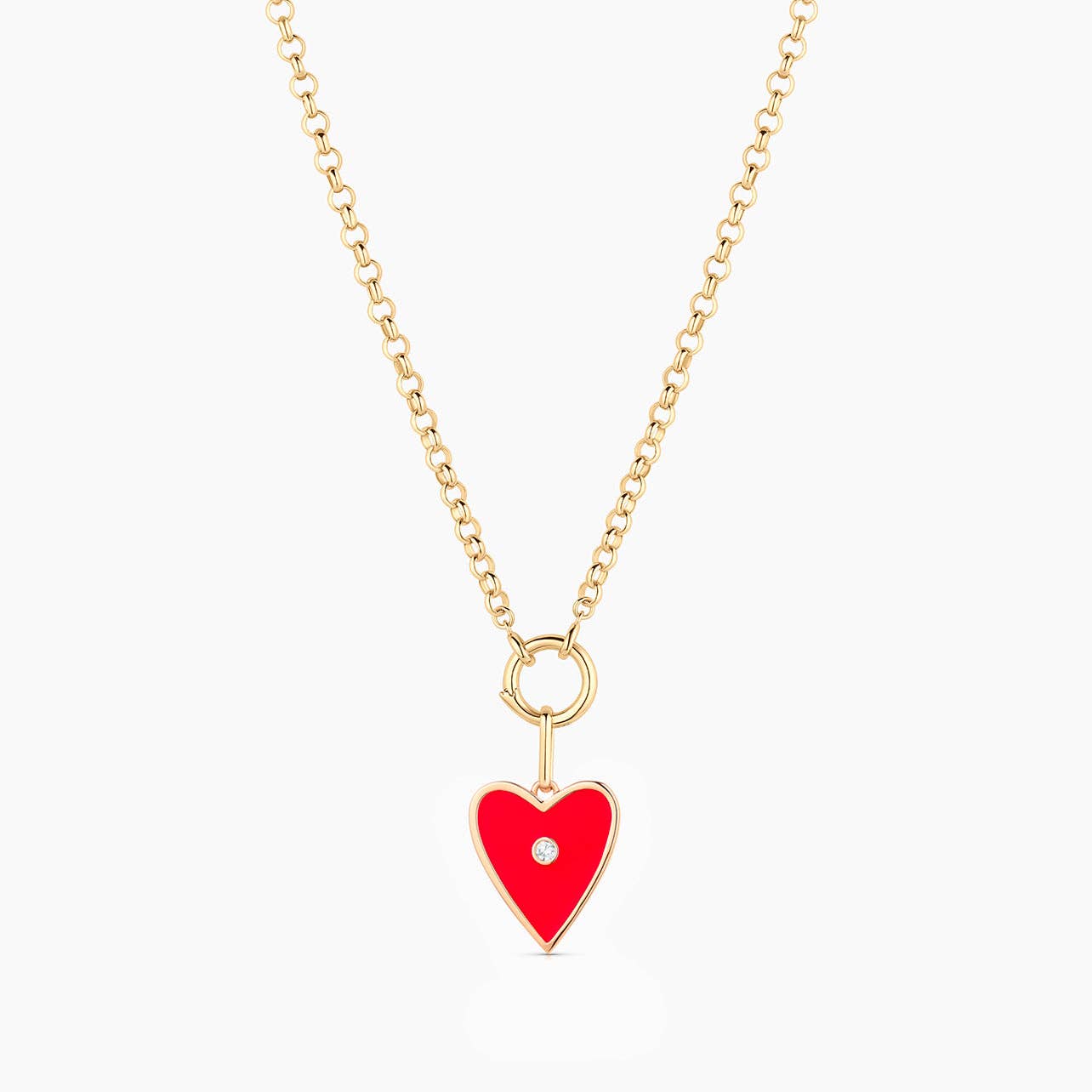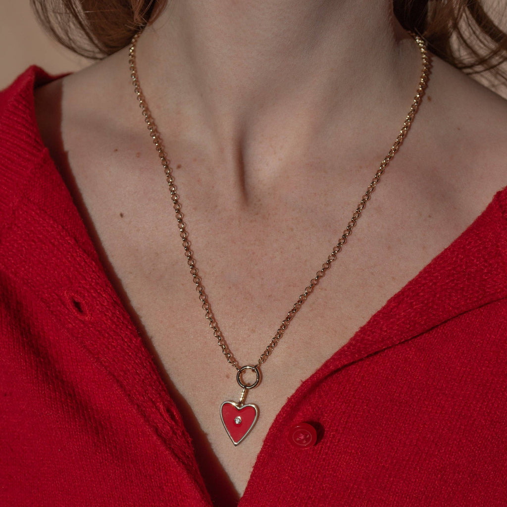 14k gold plated Amaya heart charm with limited edition red enamel and cubic zirconia stone on 3mm Vienna rolo chain necklace. Adjustable between 18-20".