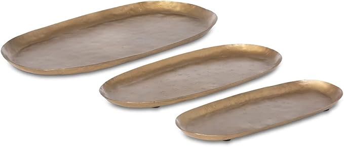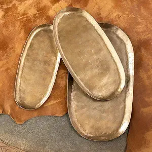 Designed for entertaining, our antiqued gold iron oval trays come in 3 convenient sizes. Add a touch of gold to your dinner table and impress your guest with this collection. Food safe, you can use them to serve your favorite dishes. Not just for food, use them just by themselves on a table or shelf as a focal point.