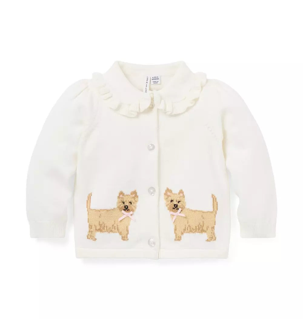 - Consider it puppy love. Our cardigan is designed with intarsia-knit dogs, a ruffle trimmed collar and little bow details too.