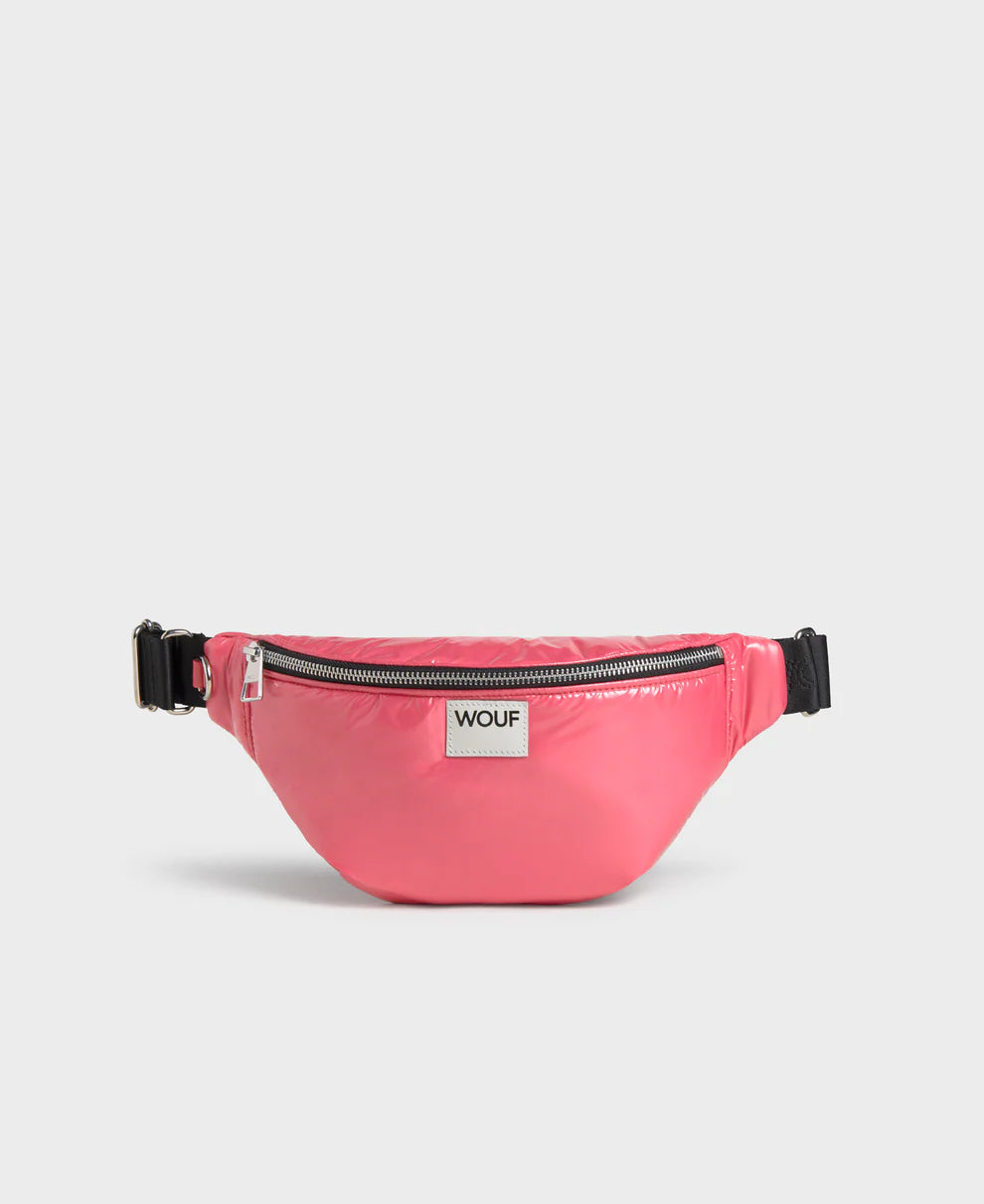 The Candy waistbag, made from 100% recycled fabrics, offers hands-free practicality with a shiny finish. It features a water-repellent surface, an adjustable strap, a main zipped compartment, and an inner pocket to keep your essentials organized.