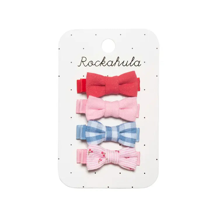 In a palette of fun and bright colours, these four little hand-tied fabric bows each adorn a salon bar clip, with each clip wrapped in soft grosgrain ribbon. Wear them one at a time, or all together!