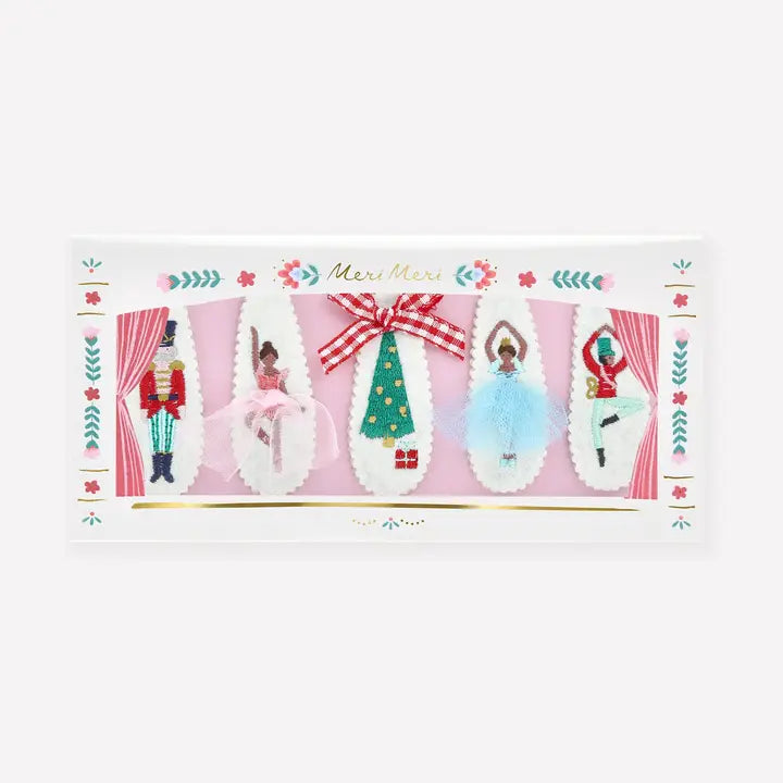 - Set of 5 hair clips featuring ivory felt with embroidered and embellished Nutcracker characters