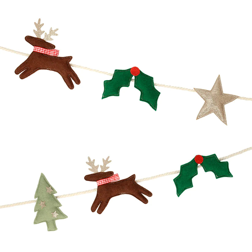 - The garland features 2 each of reindeer, holly, stars and Christmas trees, all crafted from felt