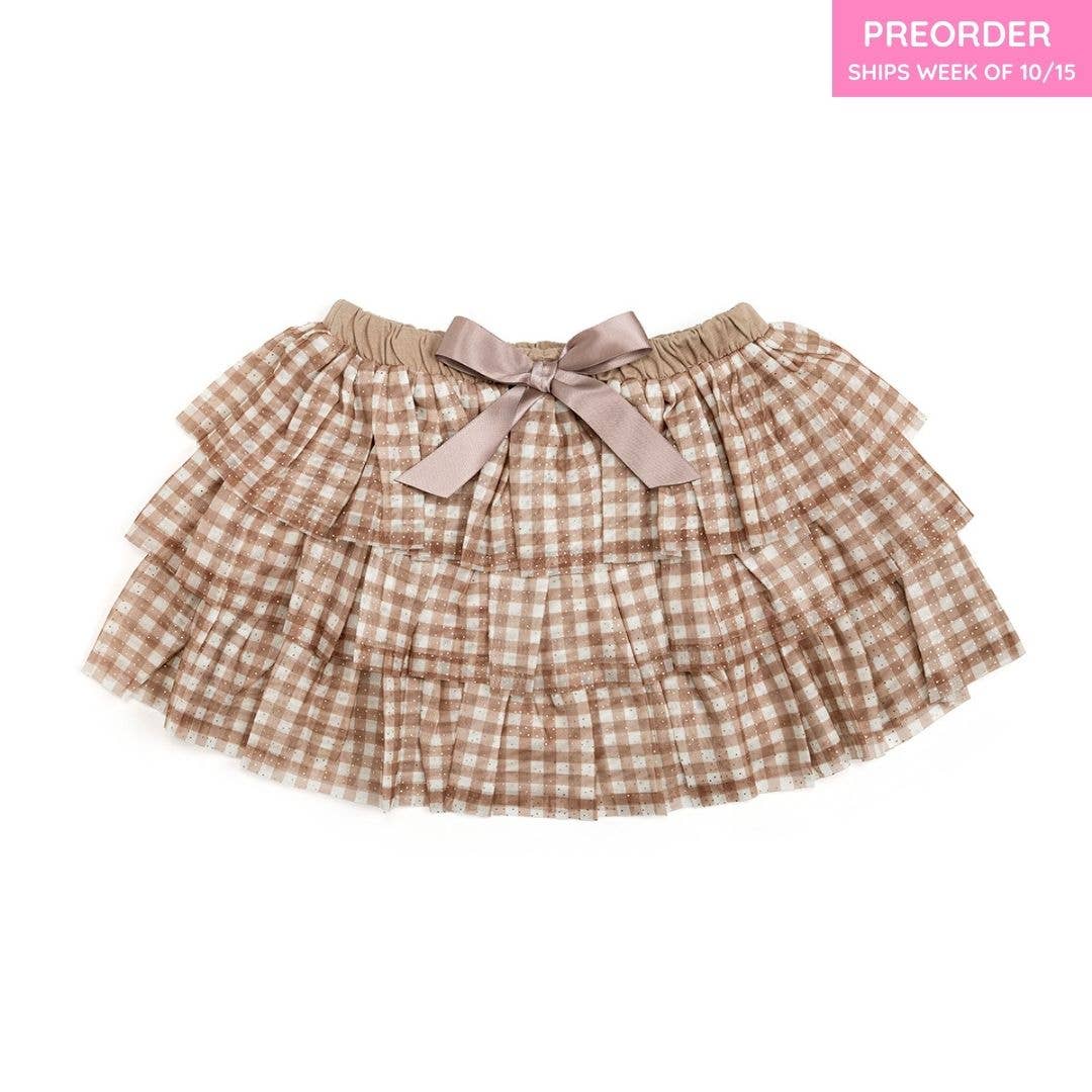 The Gingham Printed Tulle Tiered Tutu is a trendy skirt and dress up tutu for the perfect Fall look! Features: *Brown and white gingham printed tulle accented with gold glitter pin dots *Espresso cotton lining *Espresso elastic waistband