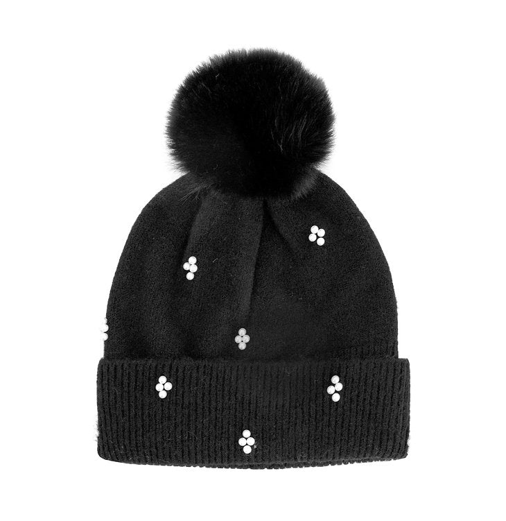 KNIT HAT WITH SCATTERED PEARLS WITH FAUX FUR POMPOM
