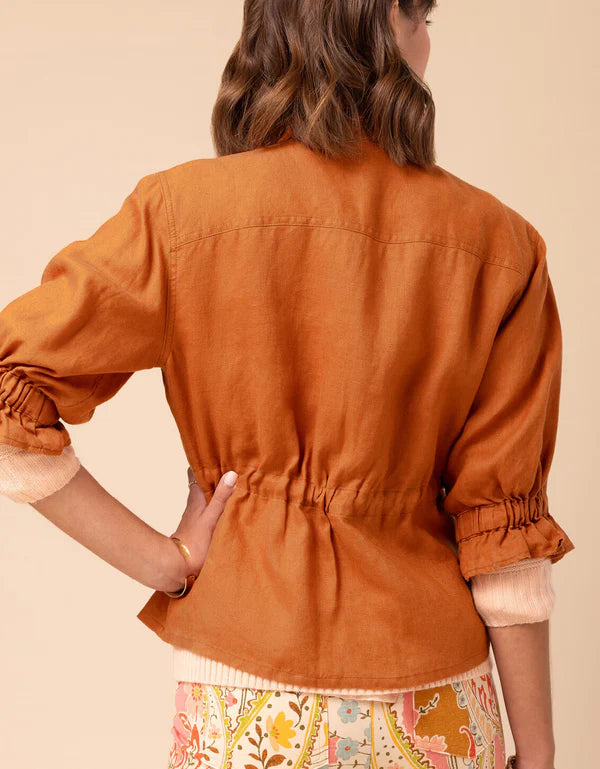 The Margot Linen Jacket in a warm pecan shade brings effortless style to any look. Featuring playful short puff sleeves and a flattering cinched waist, it beautifully balances feminine details with high-quality structure. The zipper front closure and flap pockets add practical touches. Perfect for layering, it's your go-to piece for a polished, easygoing look.