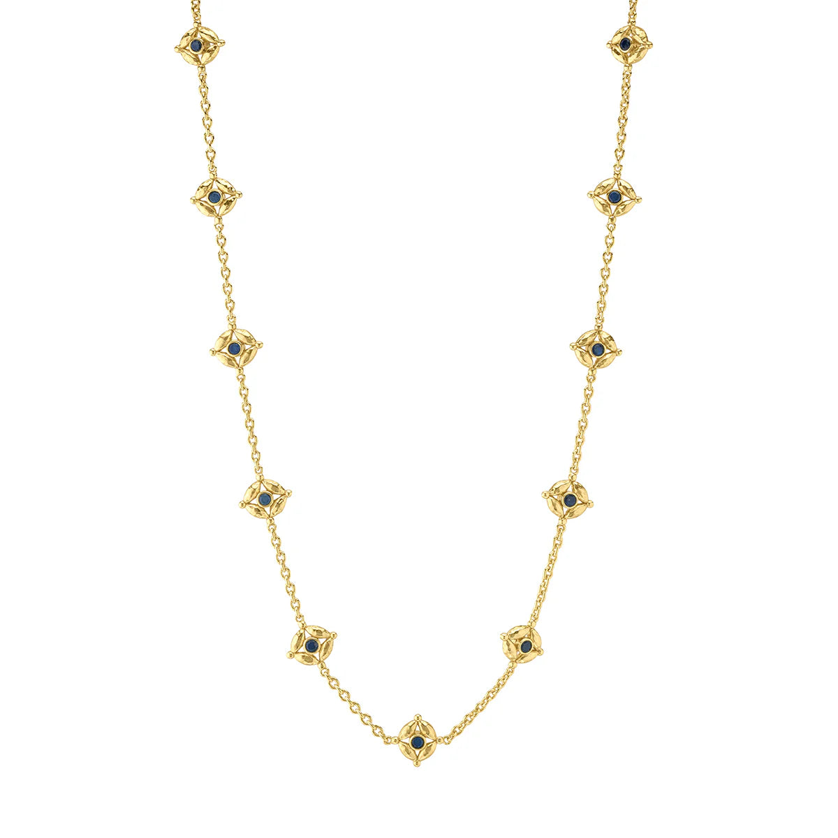 This double-sided chain necklace is a vision in bright, gleaming gold, interspersed with all-seeing eyes of lush green onyx and intense blue labradorite gemstones that flip throughout the day with a wink of playfulness. Mystical yet modern, this eye-catching piece is inspired by the cosmic place between your heart (feeling) and head (logic). Wear it long or doubled around your neck for a layered look and be reminded to trust your instincts, your inner sight.