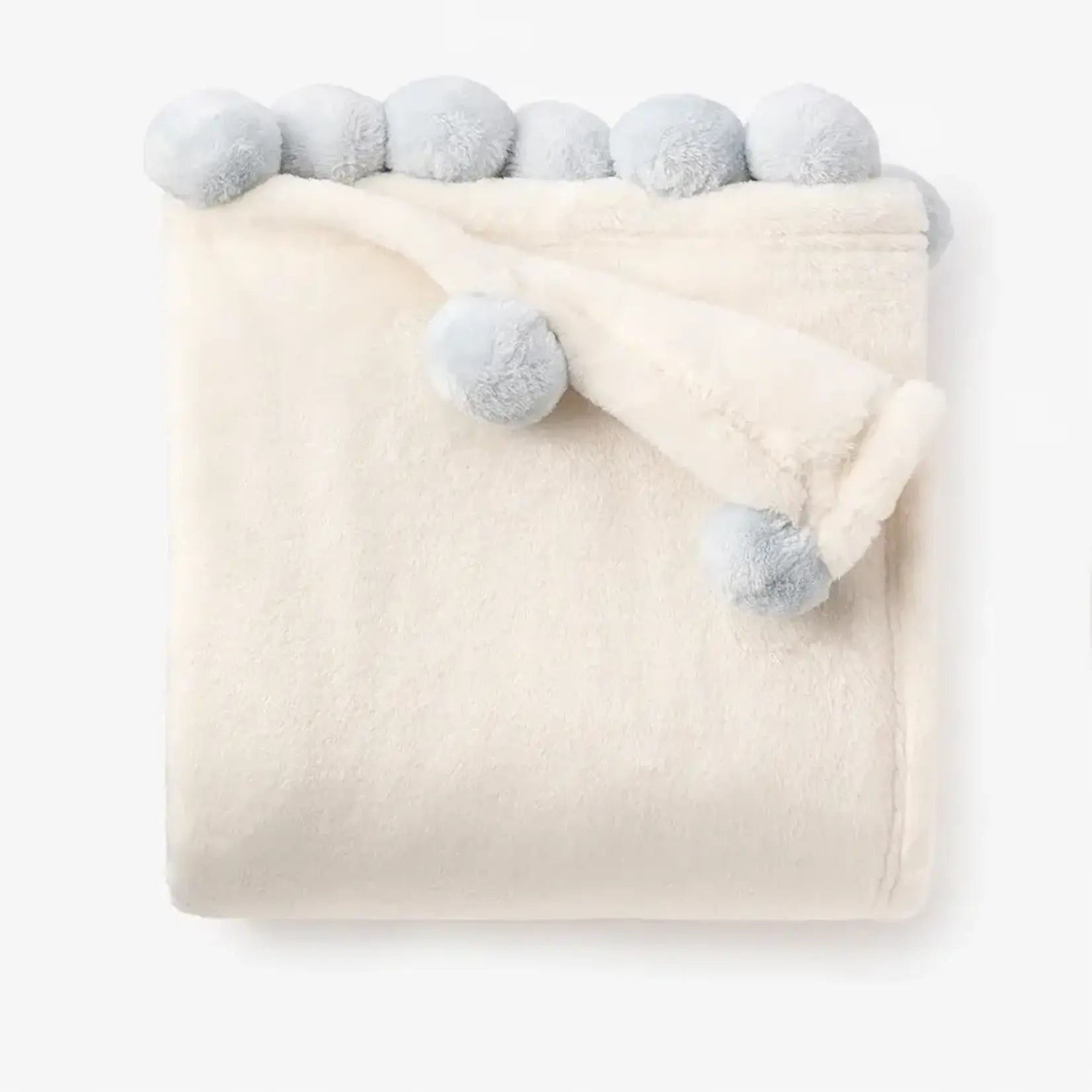 Our Pom Trim Fleece Baby Stroller Blanket is as warm and snuggly as it is durable, sure to become baby's favorite blanket. Lovingly made with mid-weight 100% soft polyester fleece, our cream-colored stroller baby blanket has adorable pom poms lining its end edges and is delivered folded and tied with a ribbon for easy gifting. It's machine washable and durable, yet will stay soft for years to come.