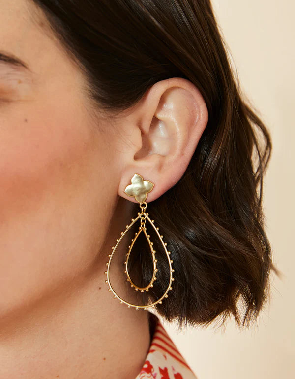 Golden beading details line the curved rings of our 18kt matte gold plated Richmond Hill Teardrop Earrings and are topped with a four leafed flower.