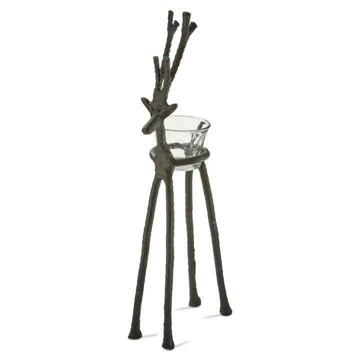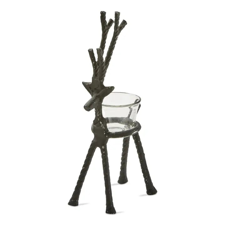 This rustic reindeer tea light holder is a fun and festive way to add light and ambiance to your home during the holiday season. the black aluminum reindeer has a glass holder for a tea light candle, and it will make a beautiful addition to your holiday decor.