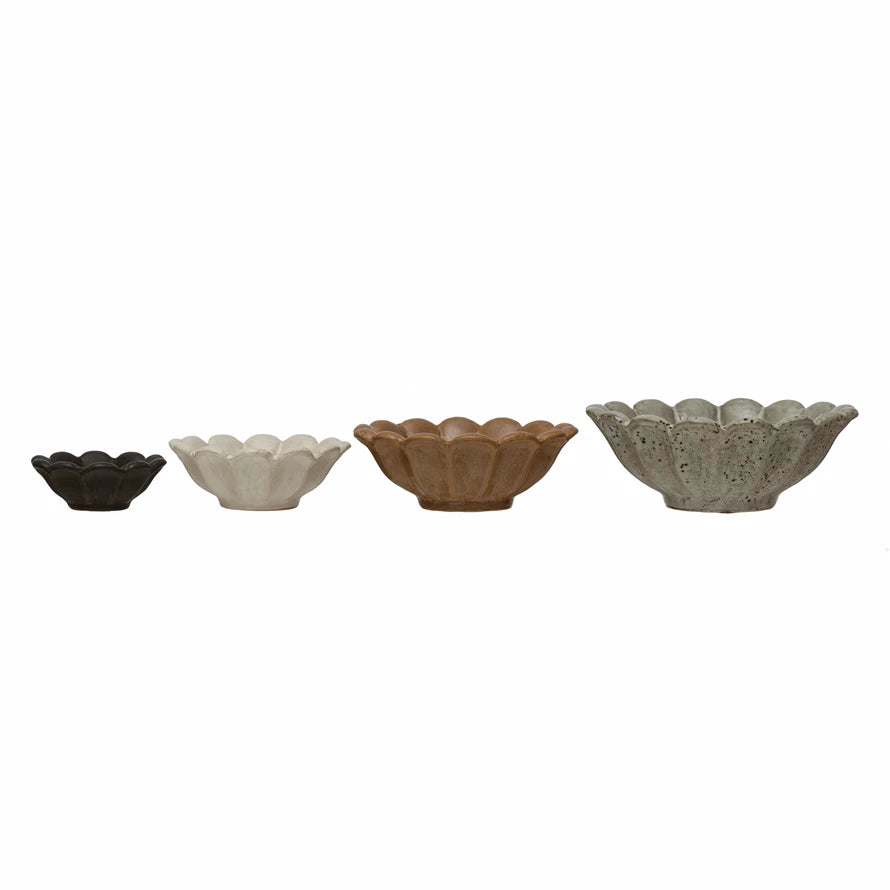 These bowls are an adorable and fun addition to any home. Made out of stoneware, these bowls have both a unique shape and reactive glaze finish that both make them one of a kind. The bowls are flower shaped and unique for storing keys, rings, or other small décor. Each bowl is a different neutral color.